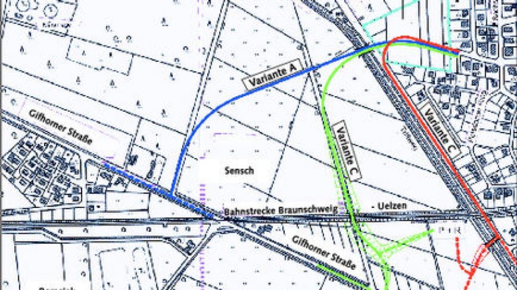 Die Planungsvariante eins (blau in der Grafik) verläuft nördlich der Bahnlinie bis zur L 292 zwischen Bahnübergang und der Siedlung Bornsiek. „Dabei gibt es jedoch die größten Bedenken hinsichtlich des Naturschutzes“, so Droßel.