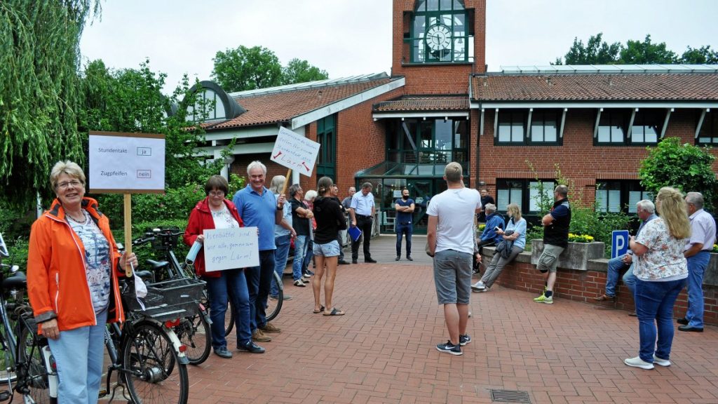 „Stundentakt ja – Zugpfeifen nein“ hieß eine der Botschaften der Bürgerinitiative (BI) gegen Zugpfeifen im Wohngebiet Isenbüttel am Donnerstagabend vor dem Rathaus. Vor Beginn der Sitzung des Bauausschusses demonstrierten rund 20 Mitglieder – und diskutierten mit Gemeindedirektor Klaus Rautenbach.