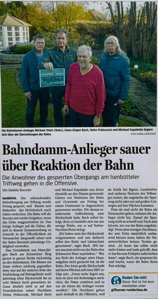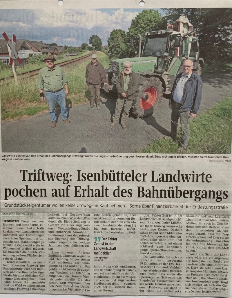 Deshalb haben sie auch das Gespräch mit den Landwirten gesucht, sich zusammengesetzt und sachlich über Lösungsansätze gesprochen. BI-Sprecher Hans-Jürgen Bach dazu: „Das Gespräch mit den Landwirten war wichtig und für uns ebenso aufschlussreich wie für die Landwirte. Danach hat sich vieles erklärt, falsche Annahmen konnten korrigiert werden und wir sind ein gutes Stück aufeinander zugekommen.“ So sehen es auch Steins und van der Post. Sie sprechen von einem konstruktiven Gespräch. Es sei deutlich geworden, dass es überhaupt nicht um eine Schließung oder Stilllegung des Bahnübergangs Triftweg geht. Das habe die BI nie gefordert. Ziel ist es, den Übergang so zu sichern, dass ein Pfeifen nicht mehr nötig aber ein Befahren möglich ist.