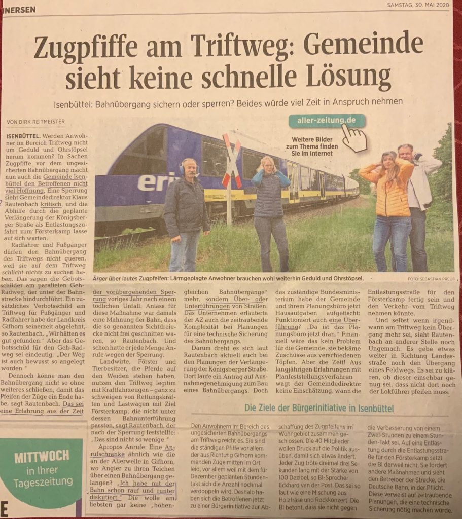 Die SPD-Fraktion im Gemeinderat Isenbüttel stellt einen Antrag ganz im Sinne der Bürgerinitiative gegen das Zugpfeifen (wir berichteten exklusiv). Zwar wird die von der BI geforderte Sperrung des Triftweg-Bahnübergangs nicht explizit genannt, dafür aber heißt es im Antrag von Fraktionssprecher Ralf May: „Die jetzige Gefahrensituation muss durch bauliche Maßnahmen, die durch eine Arbeitsgruppe in Abstimmung mit den beteiligten Partnern (Bahn, Samtgemeinde, Kreis, …) zu erarbeiten sind, so verändert werden, dass in Zukunft Unfälle ausgeschlossen sind.“