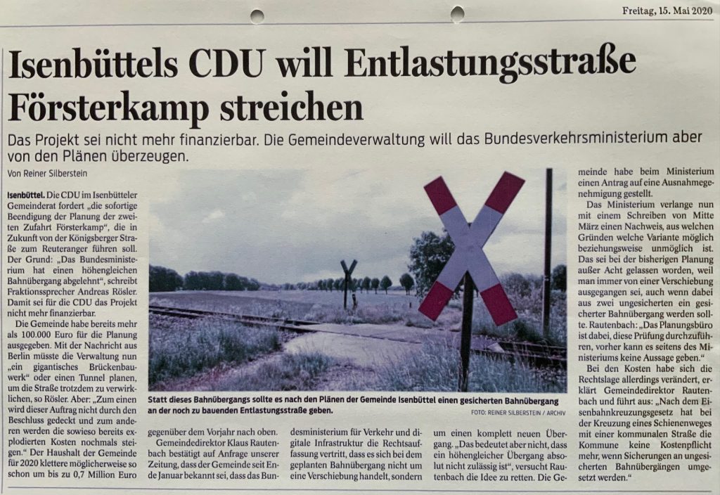 Eine zweite Zufahrt zum Wohngebiet Försterkamp – das ist eines der Dauerthemen in Isenbüttel und eines, das immer wieder für Diskussionen sorgt. Im Bauausschuss der Gemeinde ging es um einen Antrag der CDU-Fraktion. Sie forderte, die Arbeiten an den Planungen für die zweite Zufahrt sofort einzustellen. Der Gemeinderat habe bereits über 100.000 Euro für die Planung des höhengleichen Bahnübergangs Triftweg und der Entlastungsstraße Försterkamp ausgegeben.