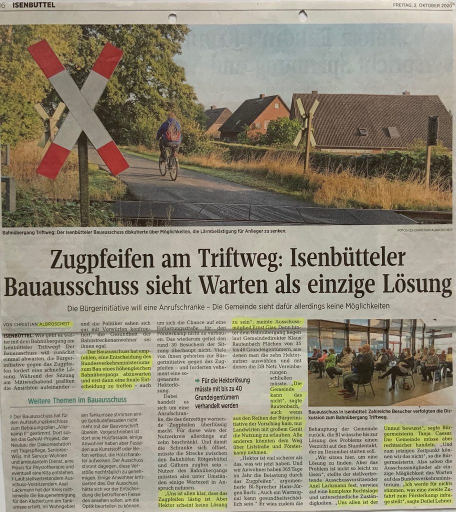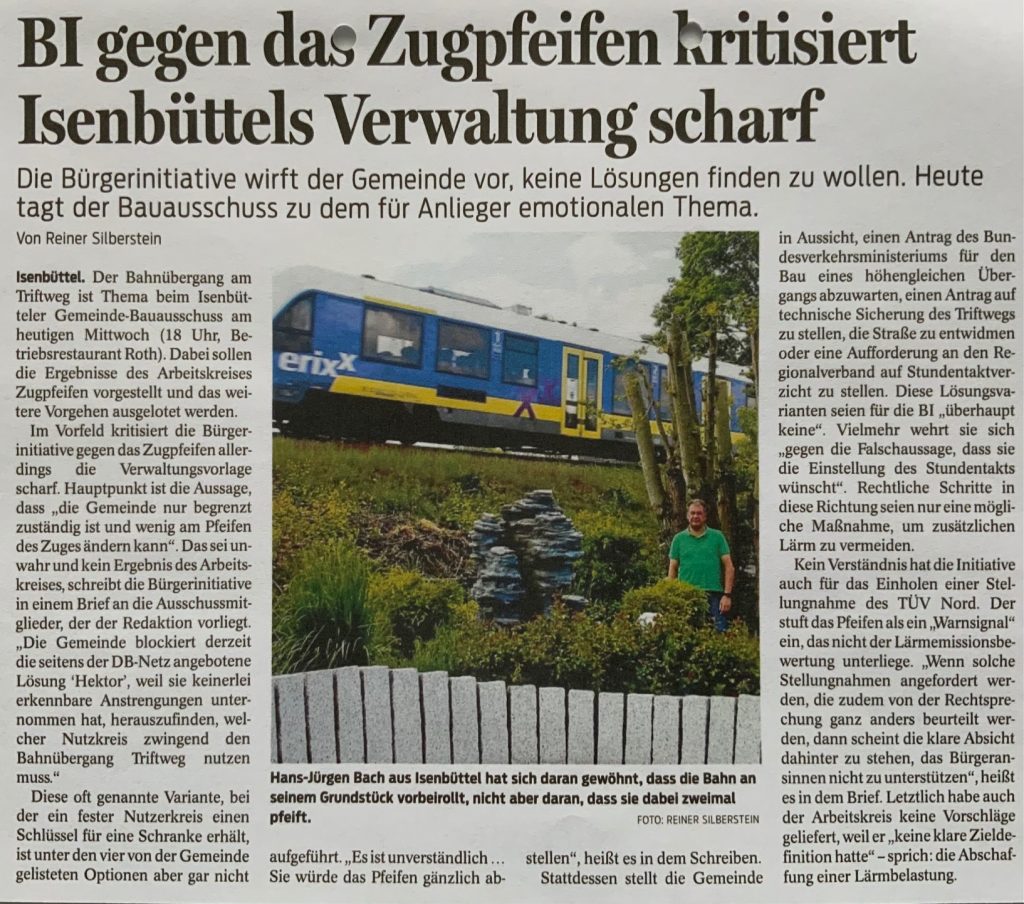 Der Bahnübergang am Triftweg ist Thema beim Isenbütteler Gemeinde-Bauausschuss am Mittwoch (18 Uhr, Betriebsrestaurant Roth). Dabei sollen die Ergebnisse des Arbeitskreises Zugpfeifen vorgestellt und das weitere Vorgehen ausgelotet werden. Im Vorfeld kritisiert die Bürgerinitiative gegen das Zugpfeifen allerdings die Verwaltungsvorlage scharf.