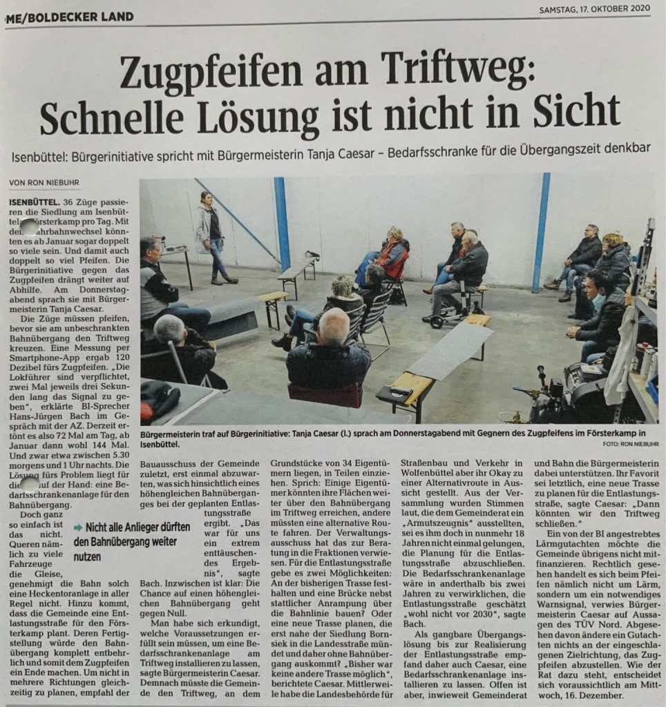 Da saß am Mittwochabend gefühlt der halbe Försterkamp vor den Mitgliedern des Isenbütteler Gemeinde-Bauausschuss – und wollte wissen, wie es jetzt weitergeht mit dem – beziehungsweise gegen das – Zugpfeifen am Bahnübergang Triftweg. Die ernüchternde Antwort: Erst einmal gar nicht.